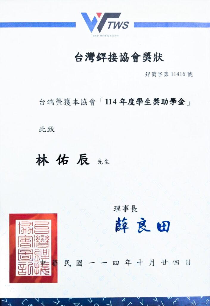 👍 恭賀林佑辰同學榮獲台灣銲接協會114年度學生獎助學金