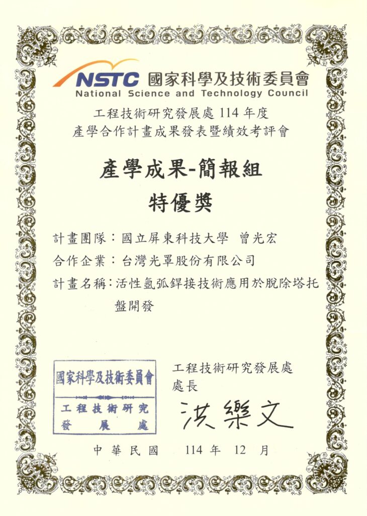 👍 恭賀曾光宏老師榮獲國科會工程處114年度產學成果簡報特優獎